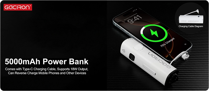 Světlo lze využít i jako powerbanku. Integrovaný výstupní kabel umožňuje snadné nabíjení externích zařízení bez potřeby dalšího příslušenství. Stav baterie indikuje LED podsvícení tlačítka.