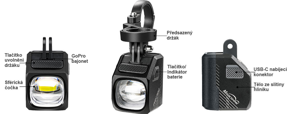 Předsazený držák pro montáž svítilny před řídítka je součástí balení. Svítilna je uchycena na standardním gopro trnu a je tak možné jednoduše nastavit i vertikální úhel svícení. Svítilnu lze z držáku okamžitě uvolnit nebo opět nasunout stlačením zámku západky. Bezdrátové dálkové ovládání MJ-6508 lze umístit blízko gripu řídítek a lze jím ovládat zapnutí a vypnutí světla, přepínání intenzit, přepínání mezi dálkovým a potkávacím světlem. Ovládání funguje na frekvenci 2.4G a má bez problémů dosah až 5 metrů.