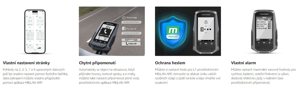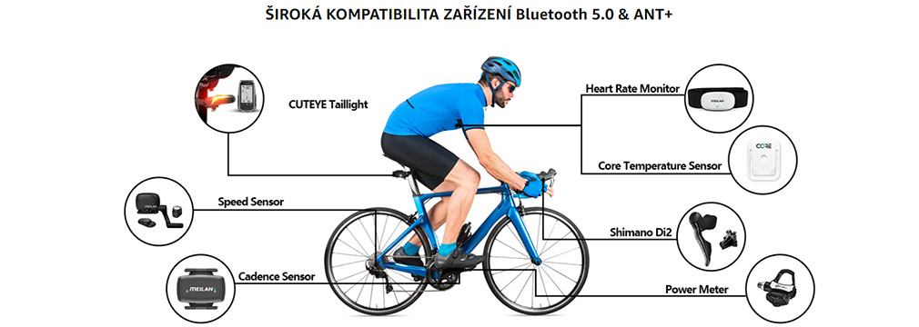Náš cyklistický počítač podporuje připojení k snímači rychlosti, snímači kadence, monitoru srdečního tepu a měřiči výkonu (powermetter), snímači teploty jádra a Shimano Di2 přes Bluetooth nebo ANT+, je také kompatibilní s naším zadním světlem s blinkry Meilan CUTEYE X3 a podporuje automatickou aktivaci jeho blinkrů při zatáčení - Pokročilé předvolby displeje