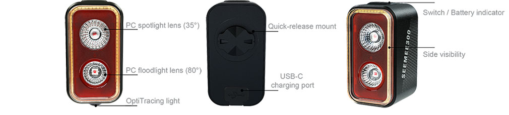 Seemee 300 pečlivě pokrývá červeným světlem co největší prostor okolo cyklisty. Na zadní straně je vybaveno dvojící TIR reflektorů svítící na blízko i do dálky - horní 35° reflektor vyzařuje do dálky a spodní 85° reflektor světlo rozprostírá více doširoka. Vespod svítilny je umístěn OptiTracing reflektor osvětlující spodní část těla cyklisty, kolo i povrch silnice. OptiTracing světlo je automaticky spínáno chytrým čidlem pouze po setmění. Svítí konstantně pokud hlavní světla blikají nebo bliká když hlavní světla svítí konstantně.
